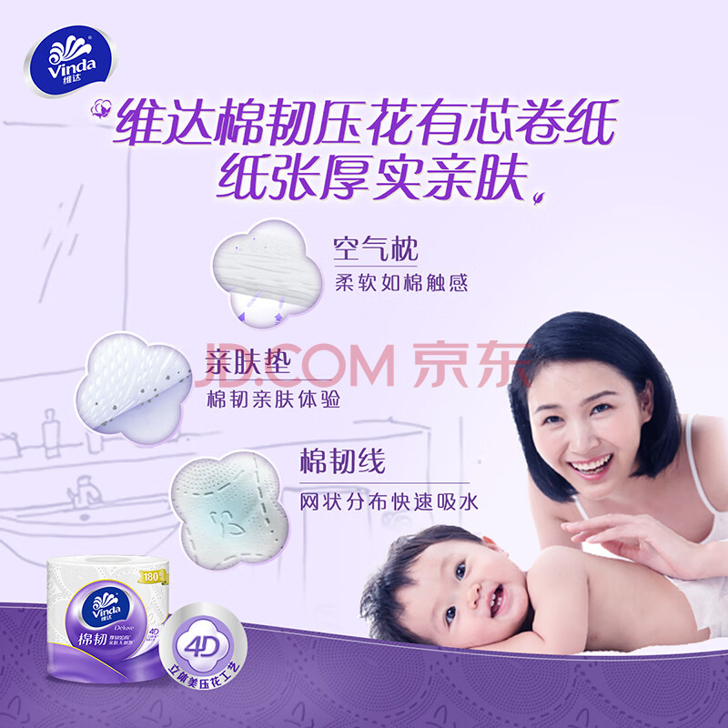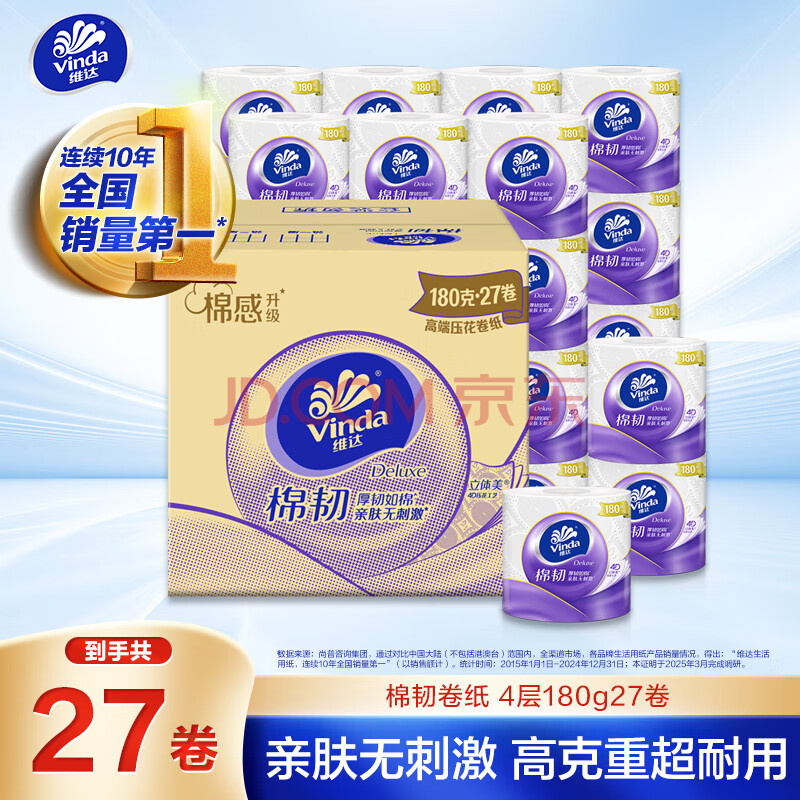 商品相册:维达(Vinda)有芯卷纸 棉韧4层180克*27卷 卫生纸 大分量卷筒纸 整箱第