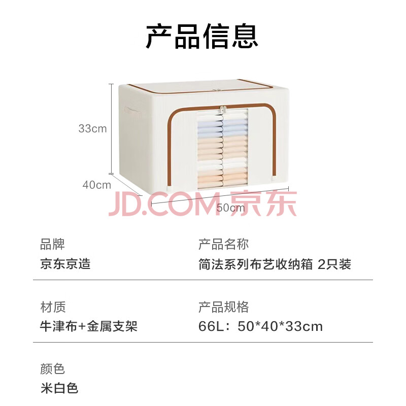 商品相册:京东京造 布艺收纳箱2只装66L家用衣物棉被储物百纳箱加厚牛津布钢架支撑第