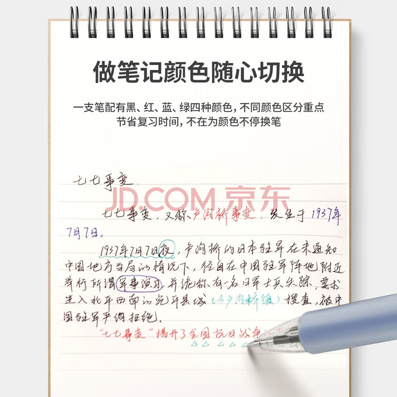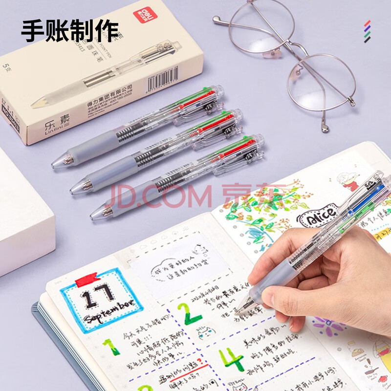 商品相册:得力(deli)多功能4色圆珠笔 0.7mm子弹头按动笔原子笔中油笔 (黑红蓝绿) 5支/盒DL-33413第