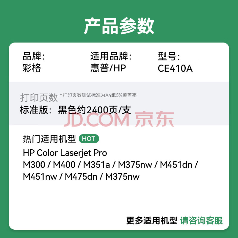 商品相册:彩格CE410A 黑色标准版硒鼓(适用惠普HP M351a M375nw M451dn M451nw M475dn 佳能 LBP7200Cdn)第