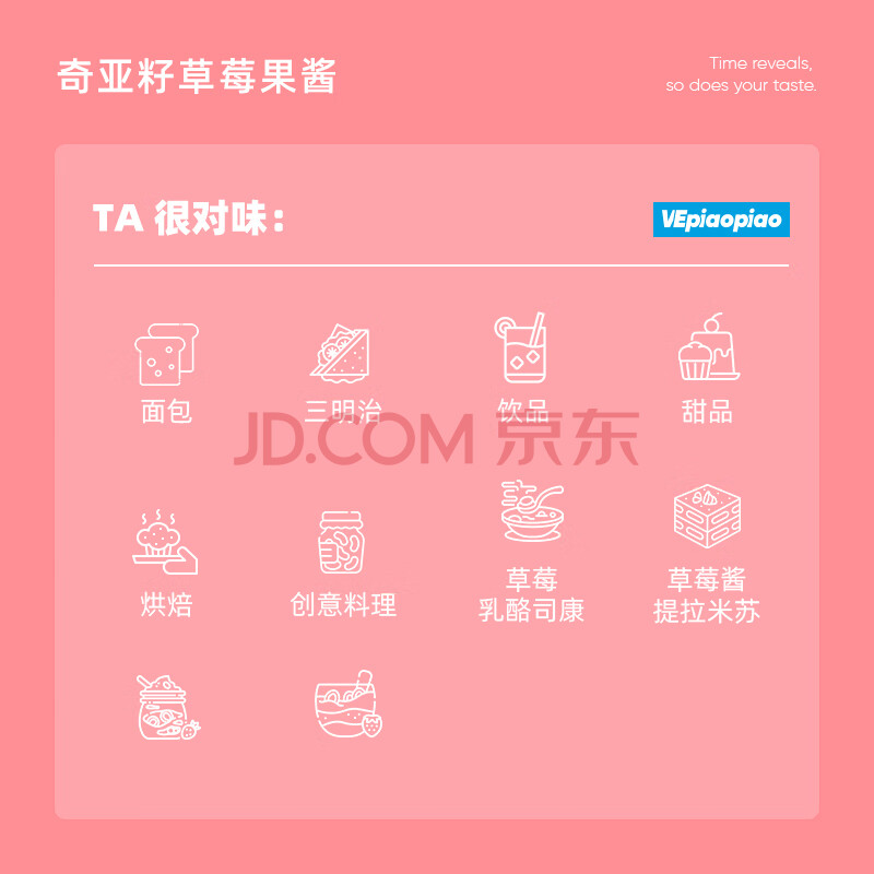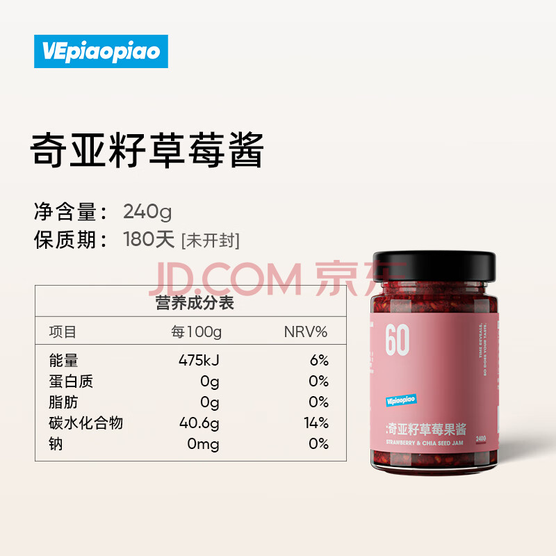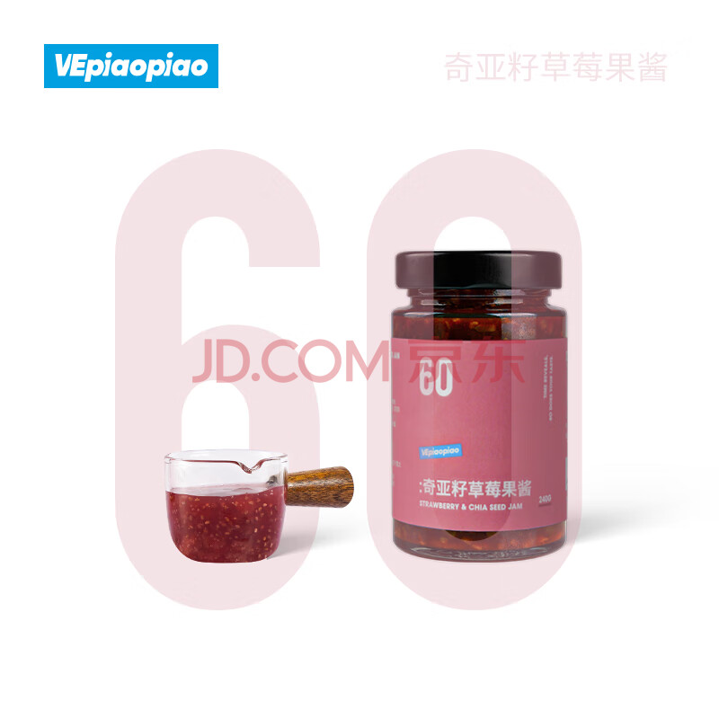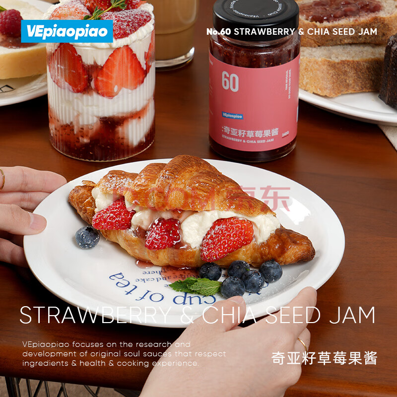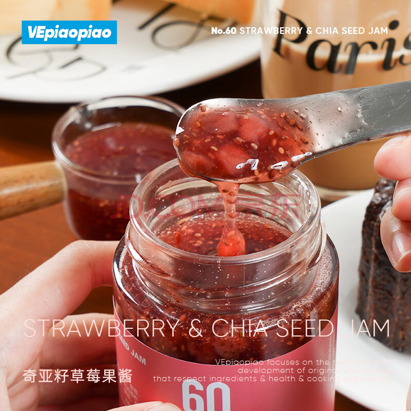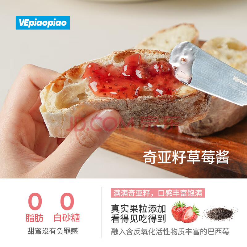 商品相册:VEpiaopiao奇亚籽草莓酱0脂肪低脂烘焙涂抹吐司面包酱冲饮品果酱净含量240g第