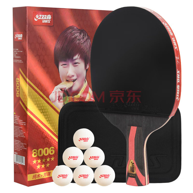 商品相册:红双喜(DHS)乒乓球拍狂飚八星级直拍H8006芳碳5+2AC单拍附拍包+乒乓球第