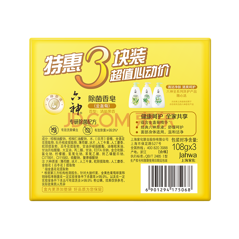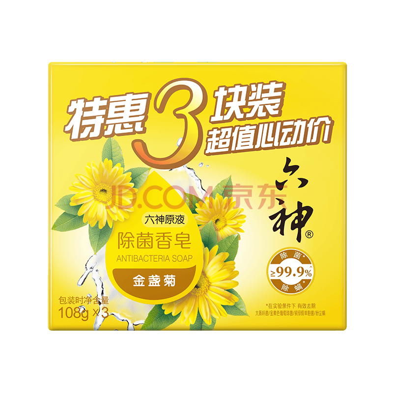 商品相册:六神【家庭3块装】金盏菊除菌香皂108g*3(洗手皂 洗脸皂 肥皂舒爽)第