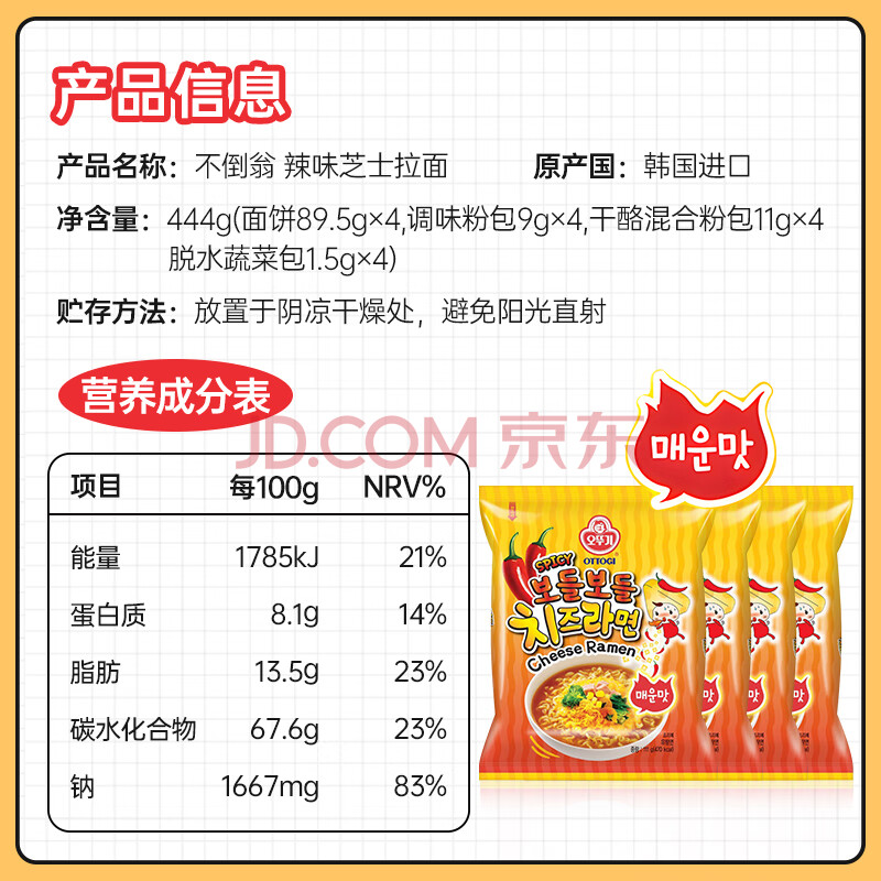 商品相册:不倒翁韩国进口 辣味芝士拉面111g*4袋 方便食品 夜宵煮面泡面 速食拉面第