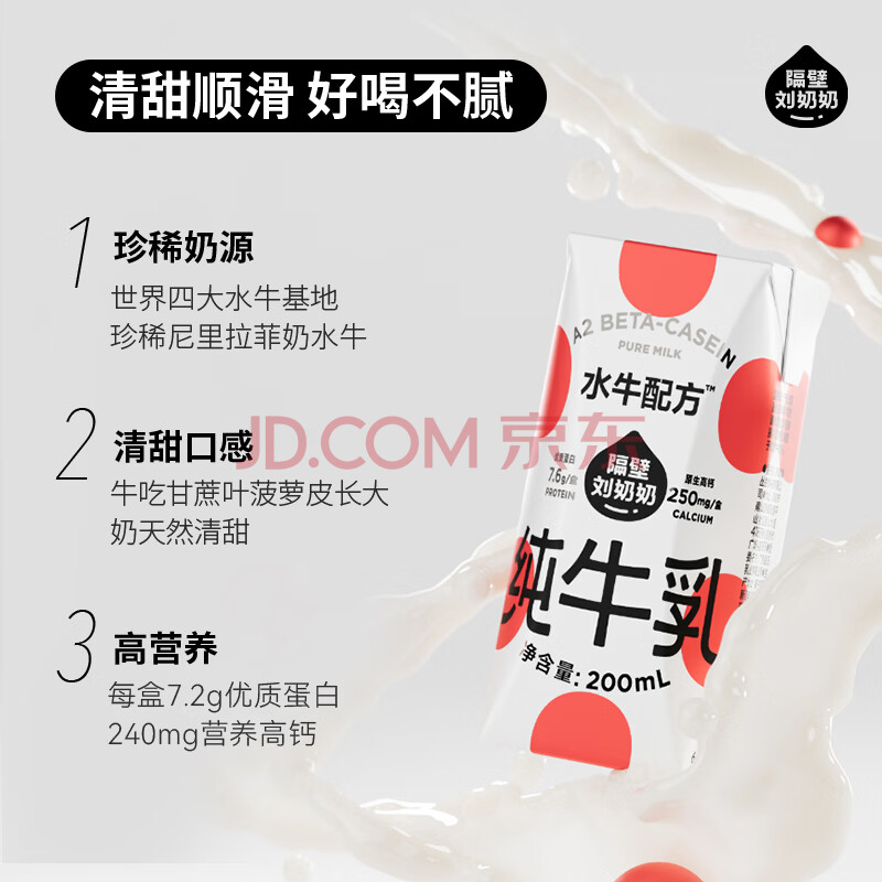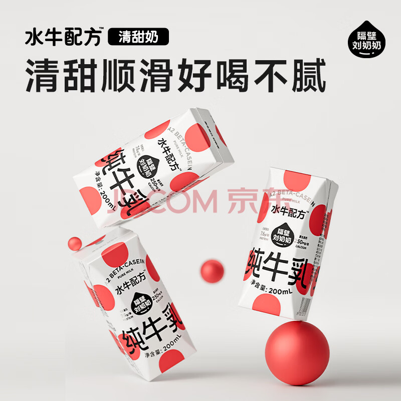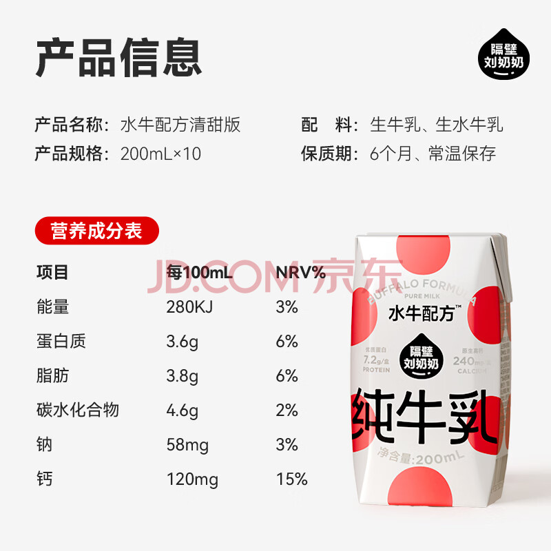 商品相册:隔壁刘奶奶水牛配方纯牛奶清甜版200ml*10盒高钙全脂纯牛奶送礼礼盒第1张/共6