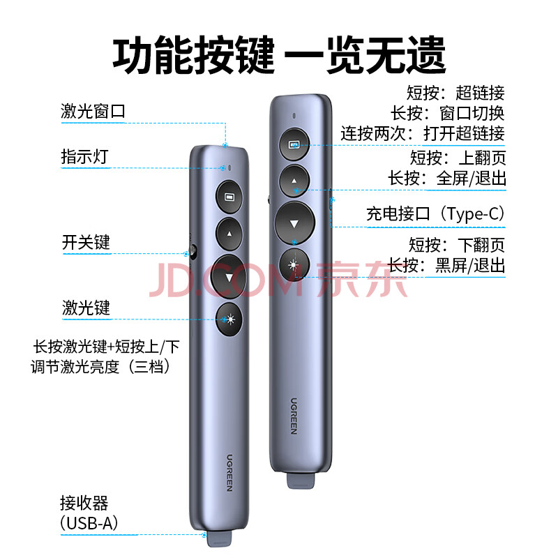 商品相册:绿联翻页笔教师用PPT激光笔多媒体投影无线演示器 适用教学课件演讲办公会议电子教鞭笔充电款15153第