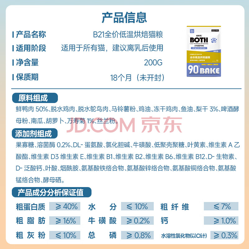 商品相册:BOTH 烘焙猫粮 幼猫成猫全阶段 鸭肉梨泪痕管理 猫粮试吃200g第