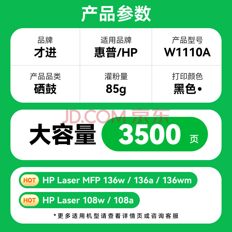 商品相册:才进适用惠普136w硒鼓110a硒鼓HP Laser MFP 136a/nw/wm打印机墨盒w1110a粉盒108w 138p易加粉108a复印一体机第