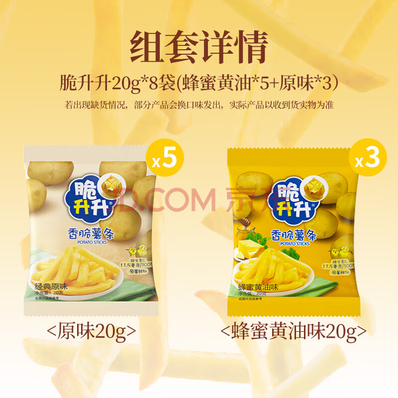 商品相册:脆升升薯条蜂蜜黄油原味香脆休闲零食袋装20g*8袋160g(原味+蜂蜜)第1张/共9