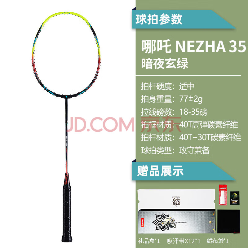 商品相册:川崎(KAWASAKI)羽毛球拍全碳素超轻单拍哪吒35进阶礼盒套装(已穿线含手胶)第
