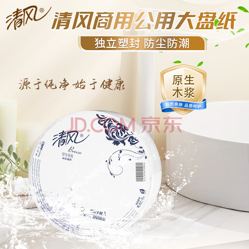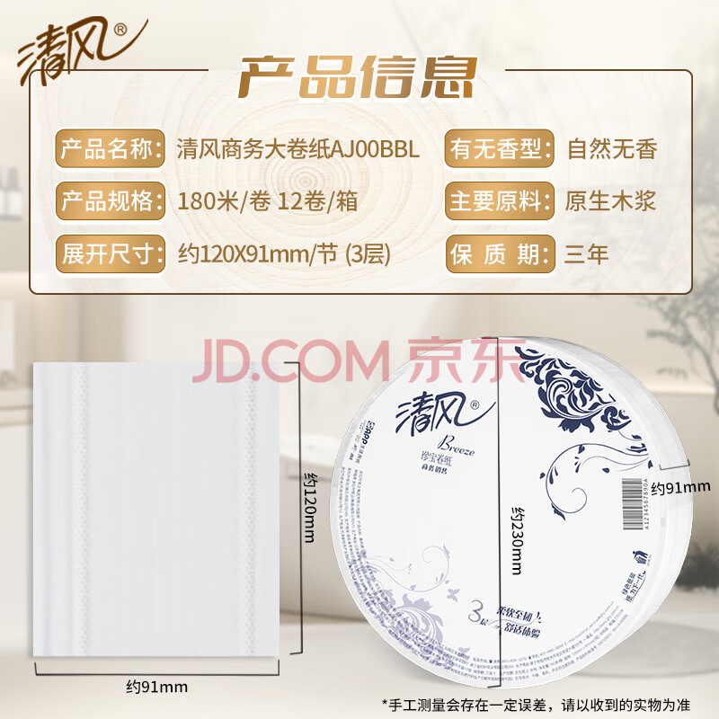 商品相册:清风有芯大卷纸3层180米*12卷商用大盘纸厕所卷筒卫生纸公用装AJ00BBL第