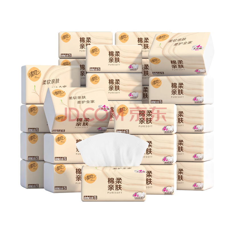 商品相册:清风抽纸 棉柔4层100抽*24包S码 卫生纸 纸巾 抽纸整箱 新老包装交替第