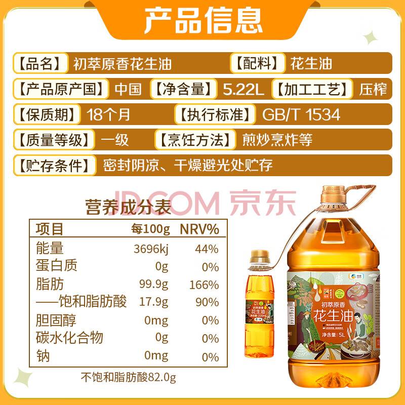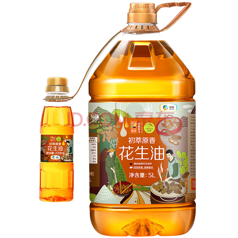 商品相册:初萃【保真花生油】中粮 花生油5L+220mL 一级 物理压榨 食用油第