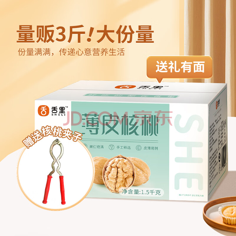商品相册:舌里原味薄皮核桃3斤装 新疆特产休闲零食坚果炒货送夹子1500g/箱第