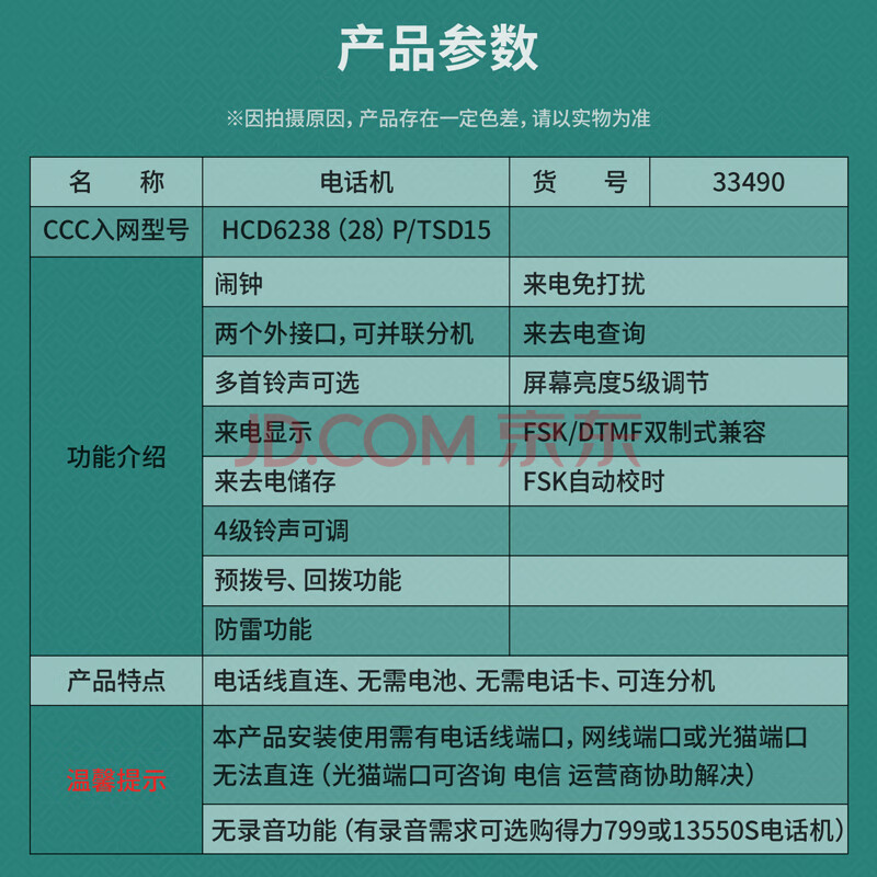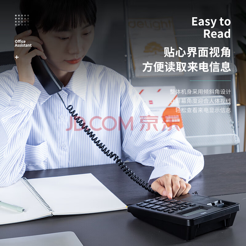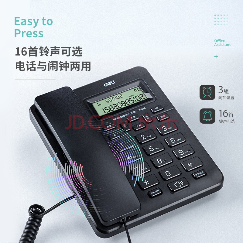商品相册:得力(deli)电话机座机 固定电话 办公家用 免提通话 大字按键 来电显示 33490黑第