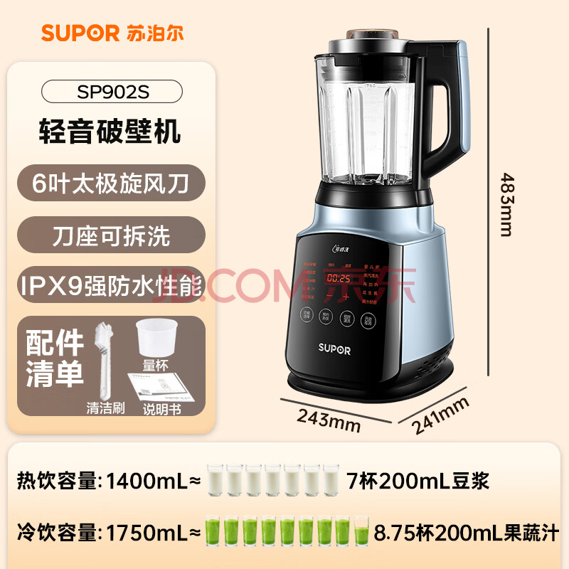 商品相册:苏泊尔(SUPOR)轻音破壁机 家用1.75L大容量3-5人适用多功能破冰碎冰五谷杂粮免滤降噪豆浆机 SP902S第