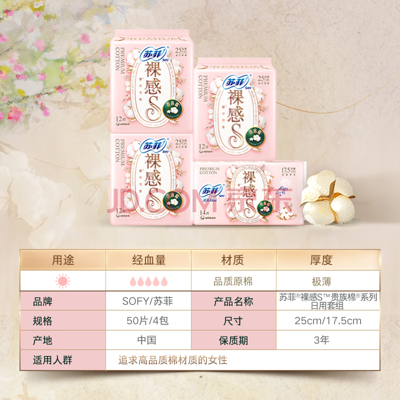商品相册:苏菲裸感S贵族棉纯棉日用卫生巾25cm*36片+17.5cm14片 干爽姨妈巾自营第