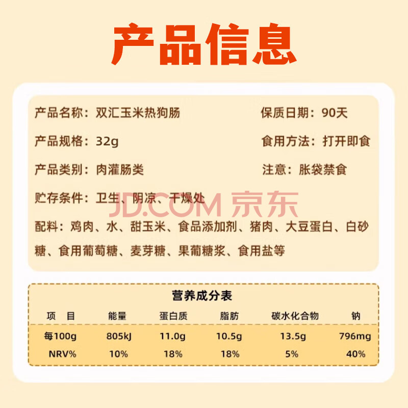 商品相册:双汇 玉米热狗肠 32g*60支 火腿肠 休闲零食 香肠 烧烤露营 速食 出游第