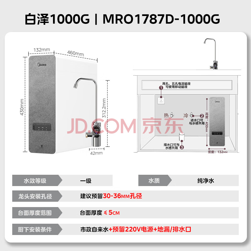 商品相册:美的(Midea)净水器【白泽1000G】0阻垢剂 家用长效反渗透RO直饮过滤器 厨房专用台下用净水机 高性价比第