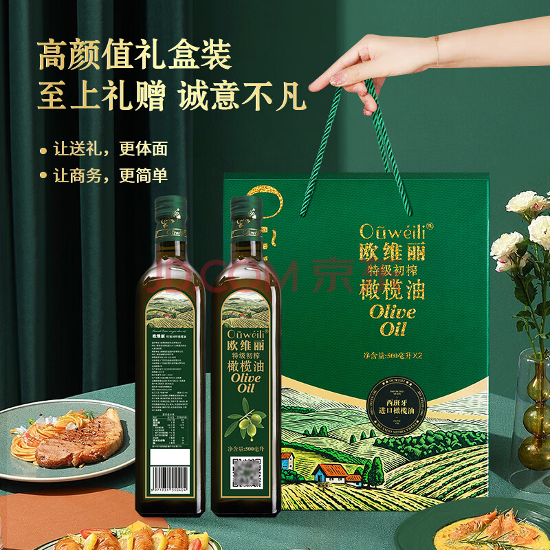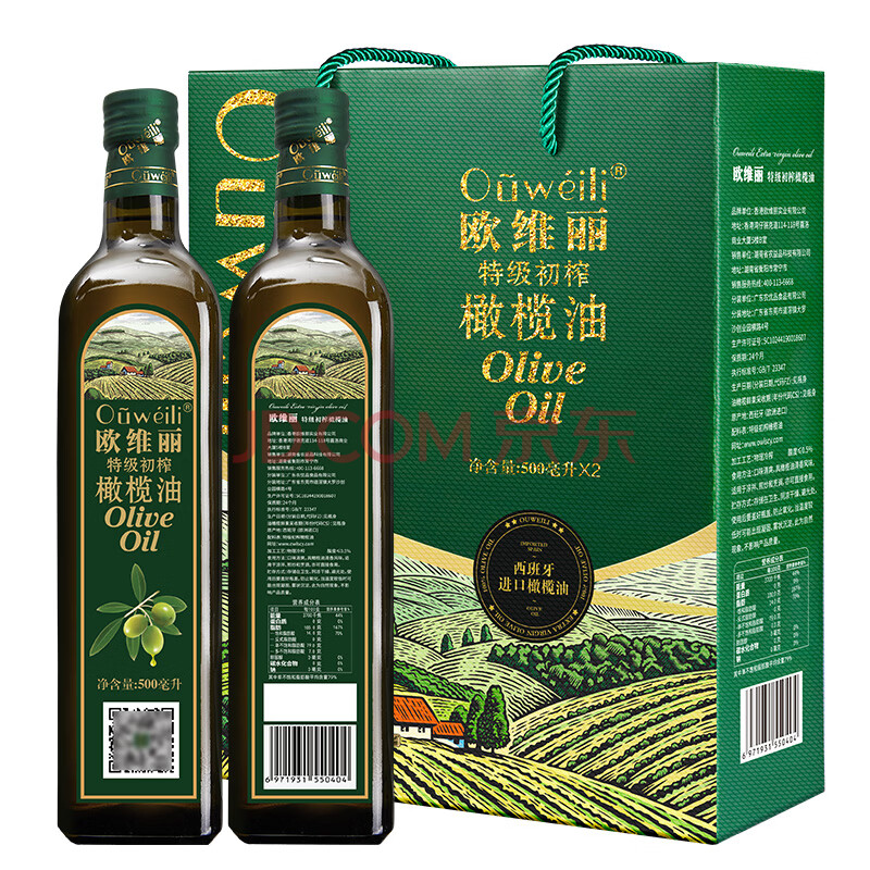 商品相册:欧维丽(Ouweili)保真橄榄油 西班牙进口原油特级初榨橄榄油礼盒500ml*2瓶第