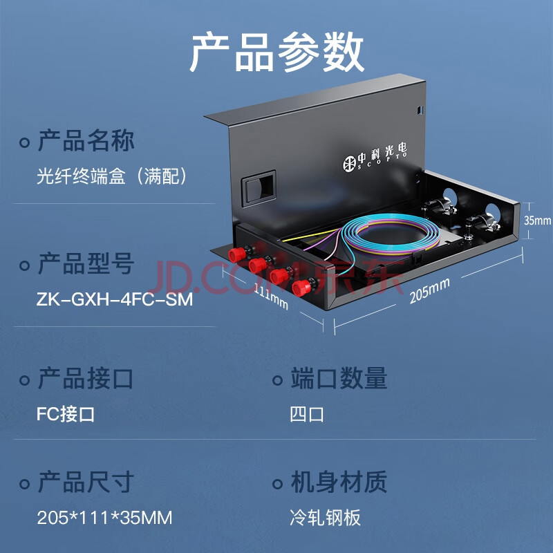 商品相册:中科光电 光纤终端盒4口 4芯光纤熔接盒 光缆接续盒 接线熔纤盒 FC单模满配尾纤法兰 壁挂式 ZK-GXH-4FC-SM第