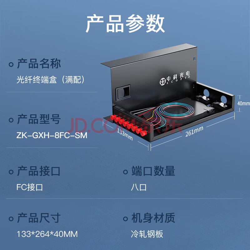 商品相册:中科光电 光纤终端盒8口 8芯光纤熔接盒 光缆接续盒 接线熔纤盒 FC单模满配尾纤法兰 壁挂式 ZK-GXH-8FC-SM第