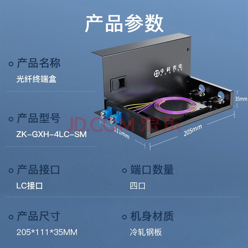 商品相册:中科光电 光纤终端盒4口 4芯光纤熔接盒 光缆接续盒 接线熔纤盒 LC单模满配尾纤法兰 壁挂式 ZK-GXH-4LC-SM第