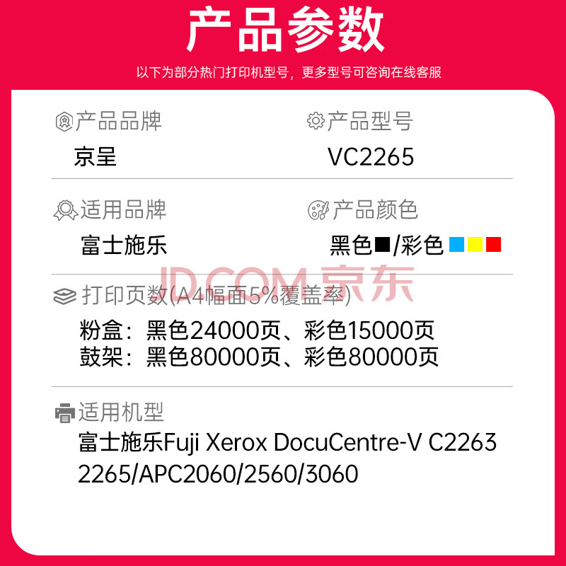 商品相册:京呈适用五代富士施乐FujiXerox DocuCentre-VC2265/2263 APC2060/2560/3060打印机硒鼓 四色大容量粉盒五代第