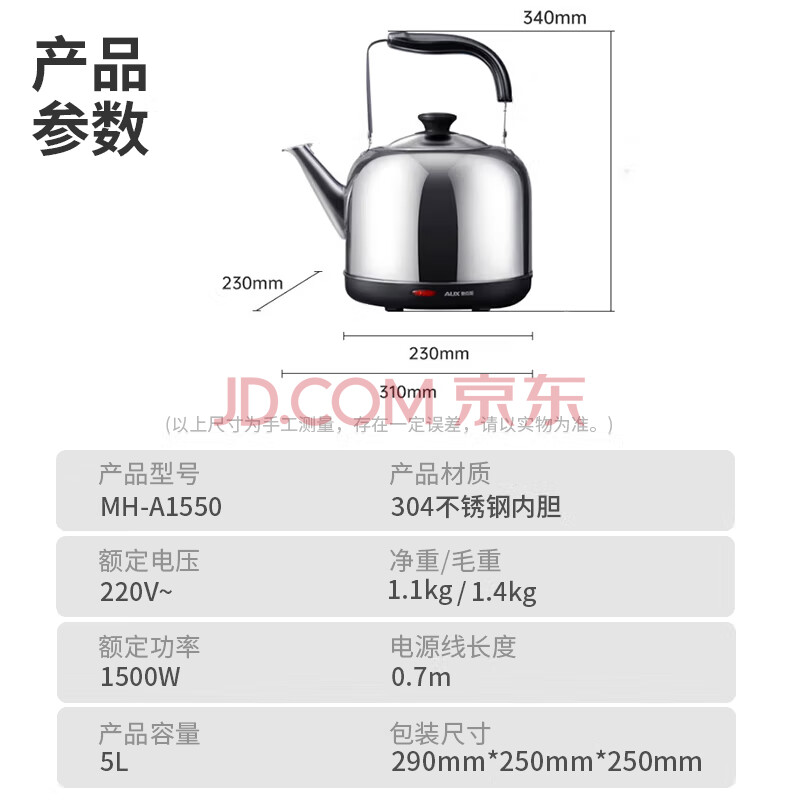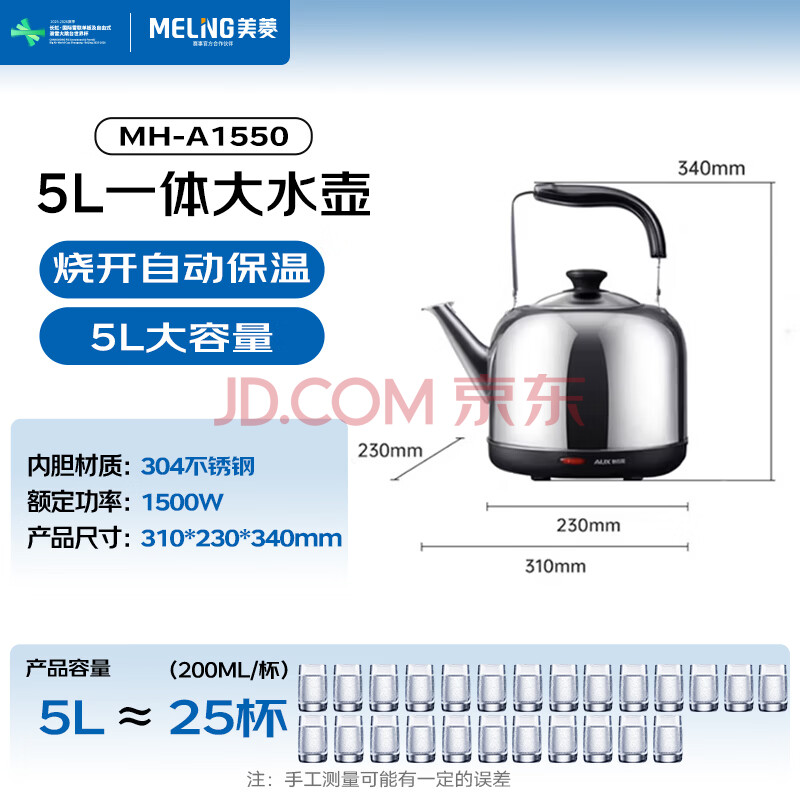 商品相册:美菱(MeiLing)电水壶电热水壶304不锈钢烧水壶5L大容量热水壶MH-A1550第1张/共7