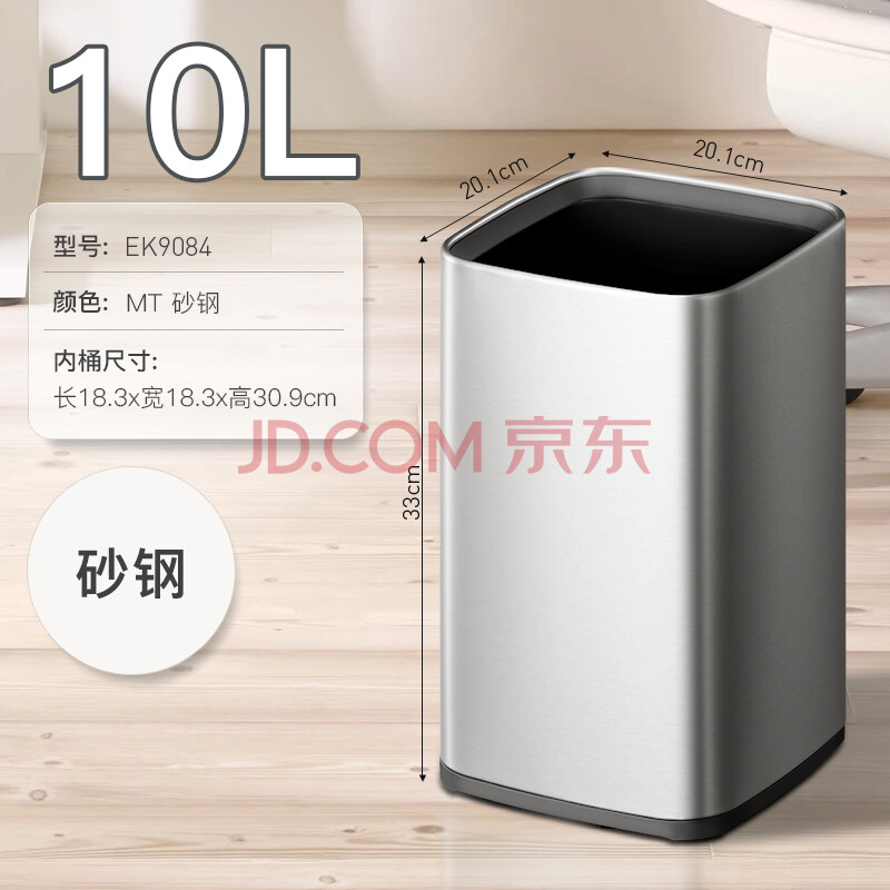 商品相册:EKO无盖垃圾桶10L砂钢家用大号厨房卫生间不锈钢纸篓张若昀推荐9084第