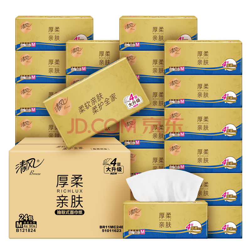 商品相册:清风抽纸卫生纸 4层90抽*24包 亲肤无刺激原木纯品 餐巾纸 整箱随机第