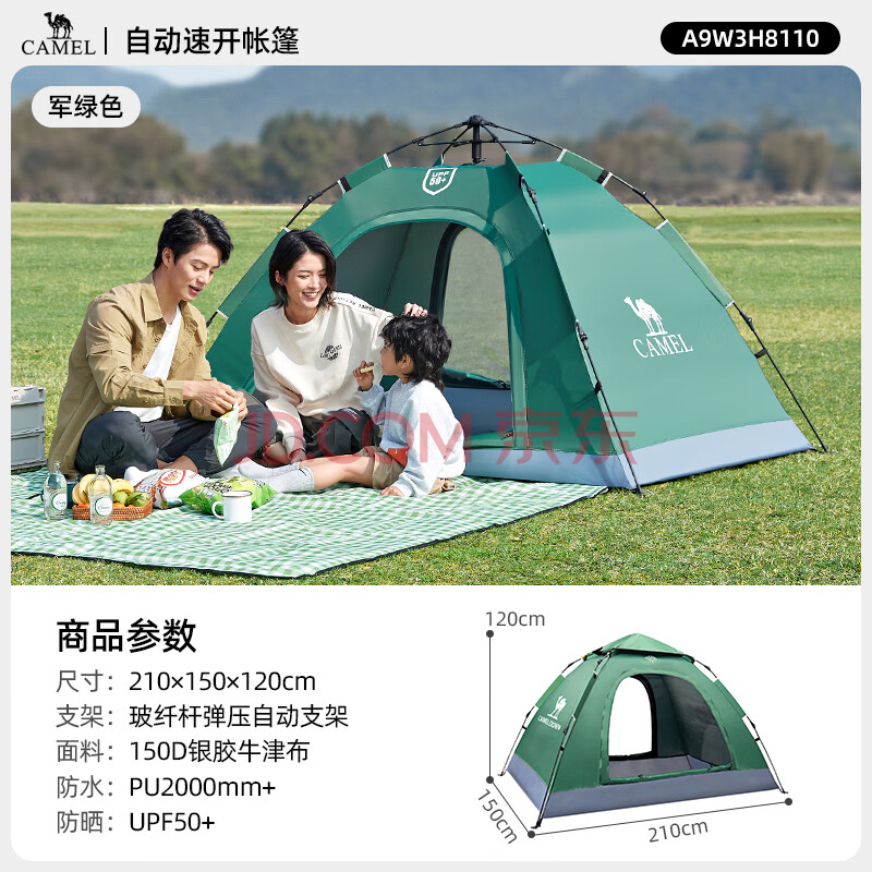 商品相册:骆驼(CAMEL)户外帐篷郊游露营防雨防晒2-3人加厚自动免搭速开帐篷 8110军绿第
