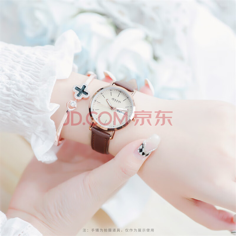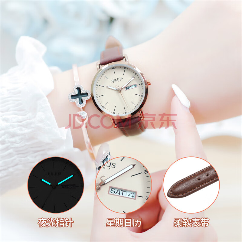 商品相册:聚利时(Julius)手表女韩版时尚学生休闲大表盘日历星期石英女士手表棕色JA-1381C第