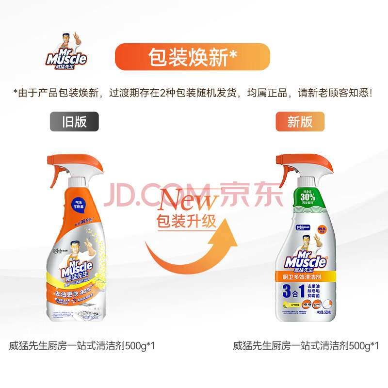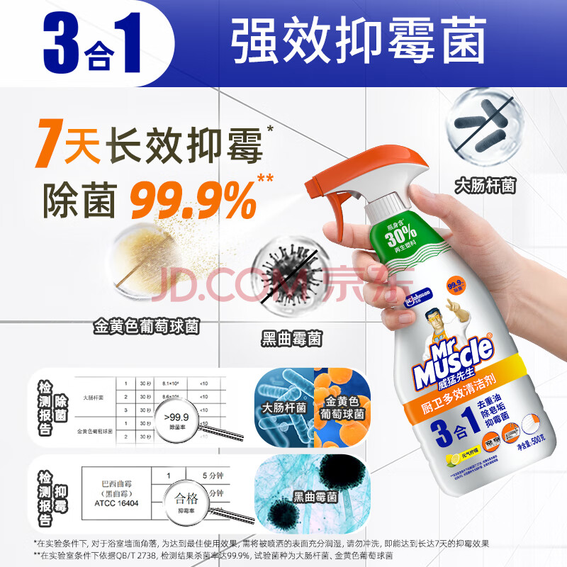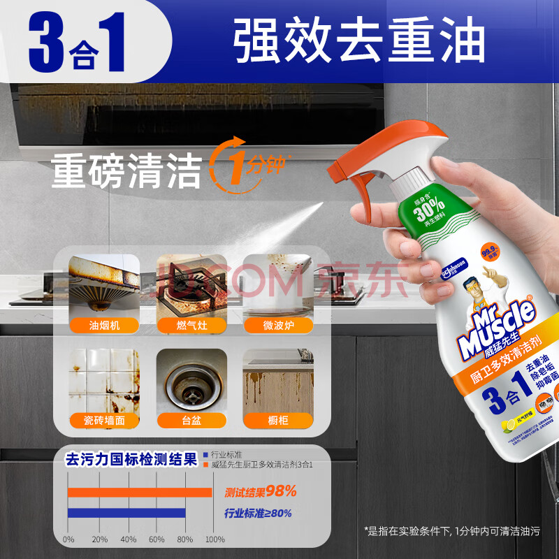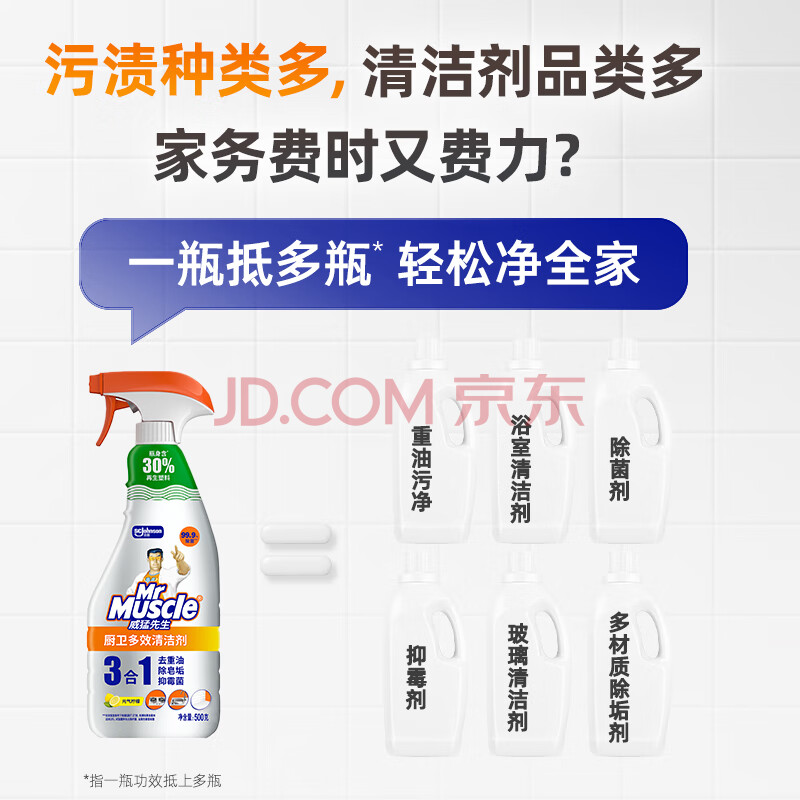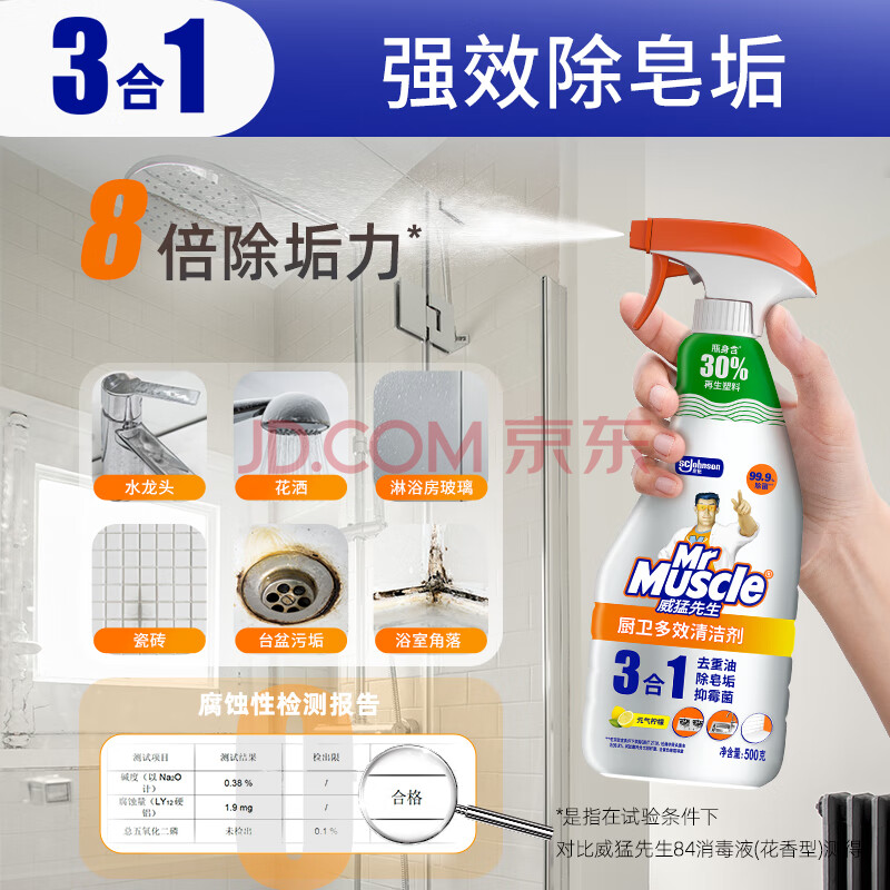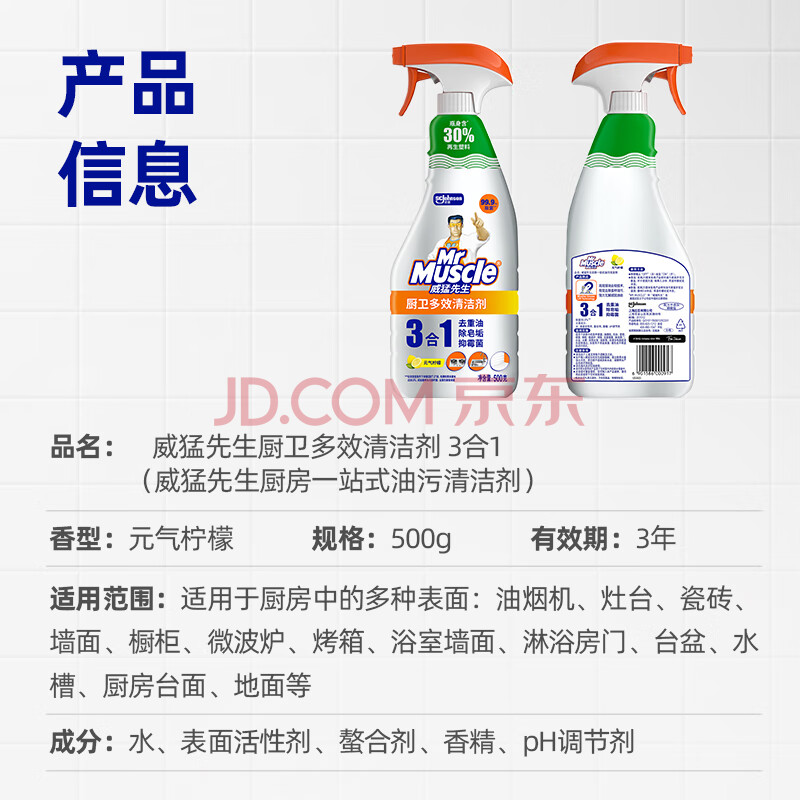 商品相册:威猛先生(Mr Muscle)厨卫三合一去油污抑霉菌除皂垢多功能清洁剂 500g 元气柠檬第
