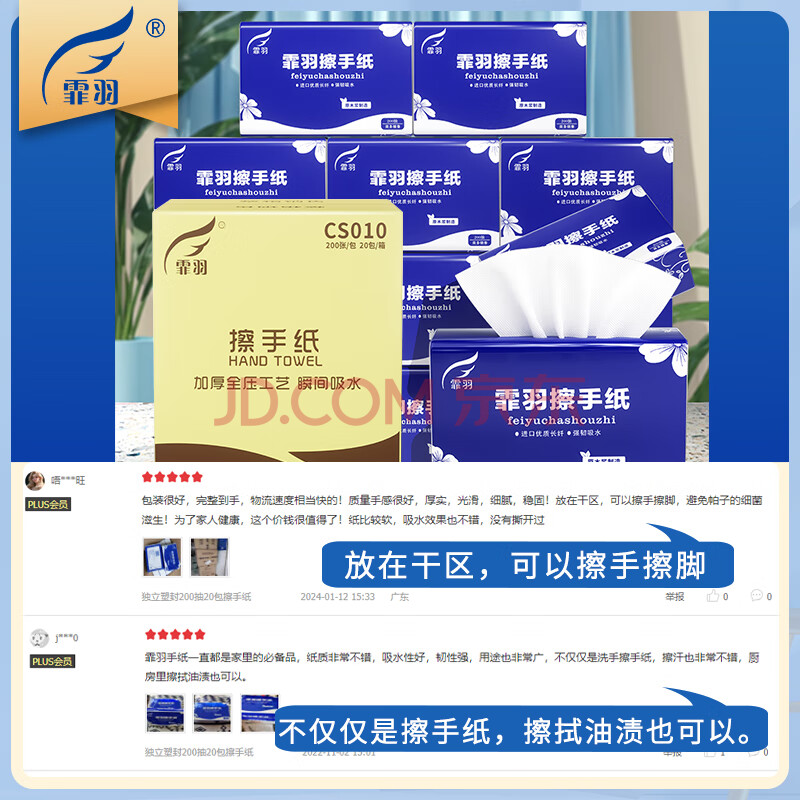 商品相册:霏羽擦手纸1层200抽*20包抽取式酒店厨房用加厚卫生间商用干手纸CS010第