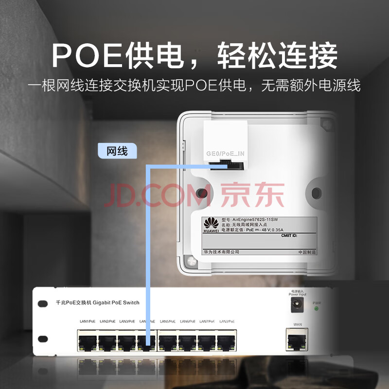 商品相册:华为全屋WiFi6套装5双网口86面板AP+8口POE交换机 家用一拖五无线千兆ac+ap路由器组网 坤灵AP162E灰色第
