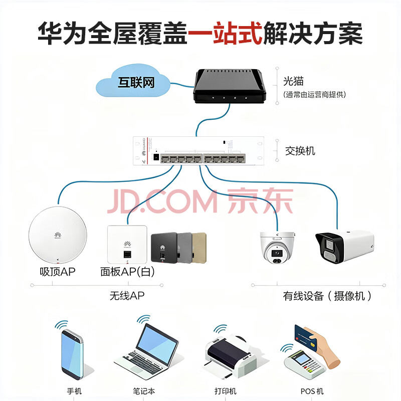商品相册:华为全屋WiFi6套装2个吸顶AP面板+3个双网口86AP面板+8口交换机 无线千兆AC+AP路由器 3000M企业级网络第1张/共8