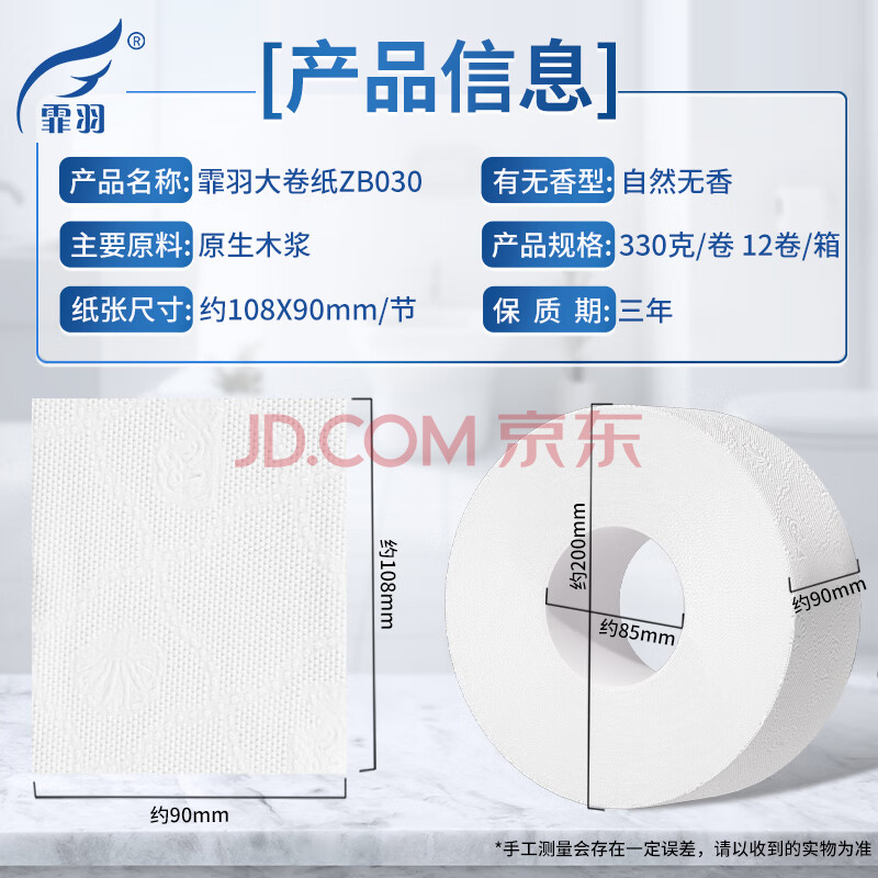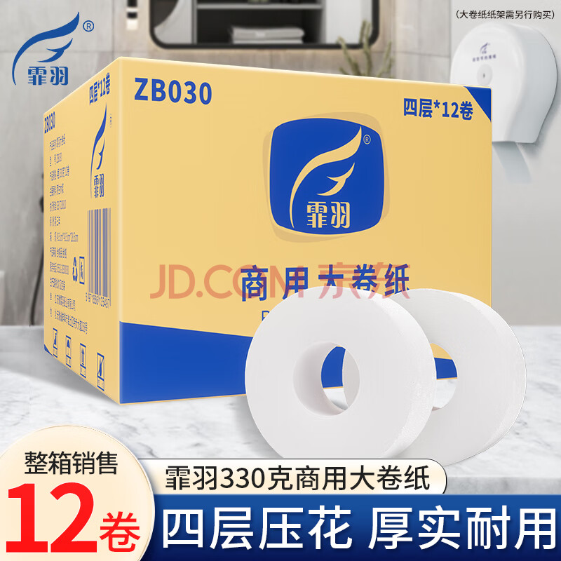 商品相册:霏羽有芯大卷纸商用4层330克*12卷大盘纸厕纸酒店大号卫生纸手纸ZB030第