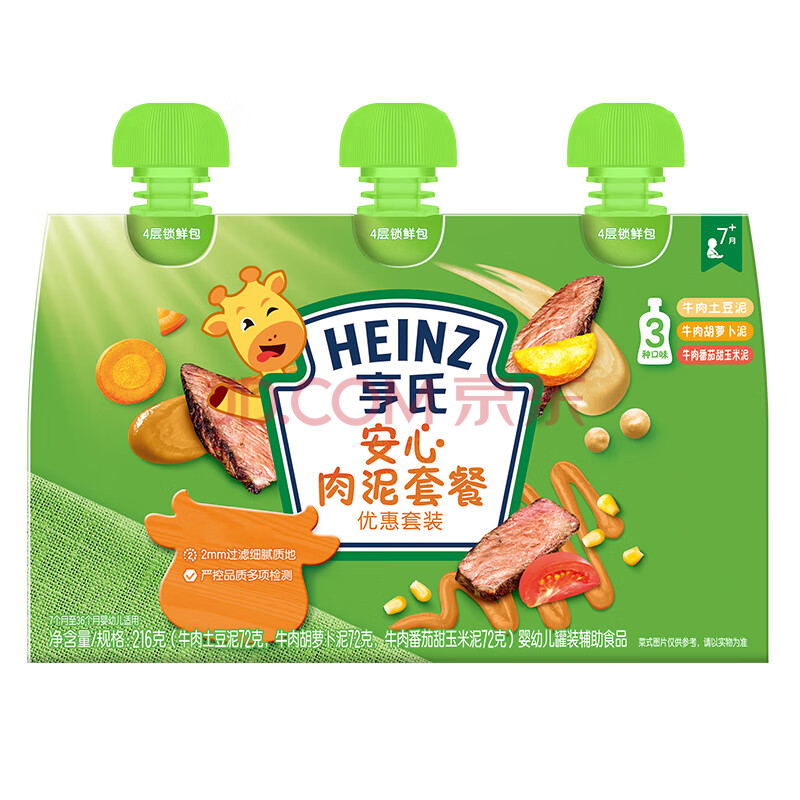 商品相册:亨氏(Heinz)宝宝辅食果泥婴儿肉泥牛肉佐餐泥纯净0添加零食套装 72g*3袋第1张/共7