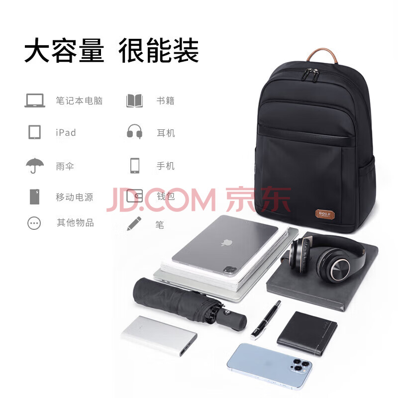 商品相册:高尔夫(GOLF)双肩包男士旅行背包男17.3英寸电脑学生书包休闲背包女 黑色加大第