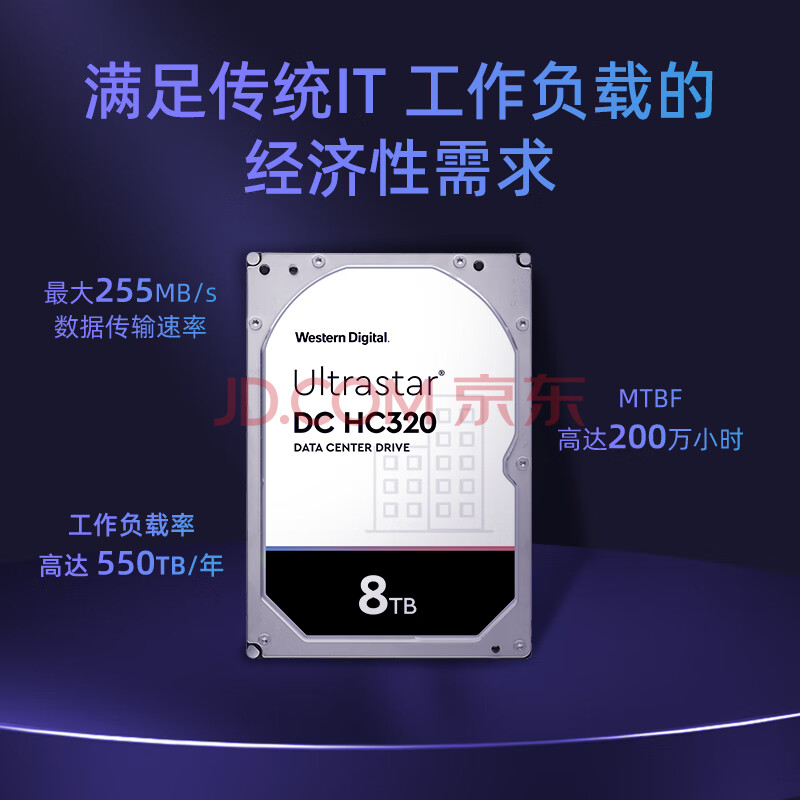 商品相册:西部数据(WD)8TB 企业级机械硬盘DC HC320 SATA 7200转256MB CMR垂直 服务器硬盘 3.5英寸HUS728T8TALE6L4第