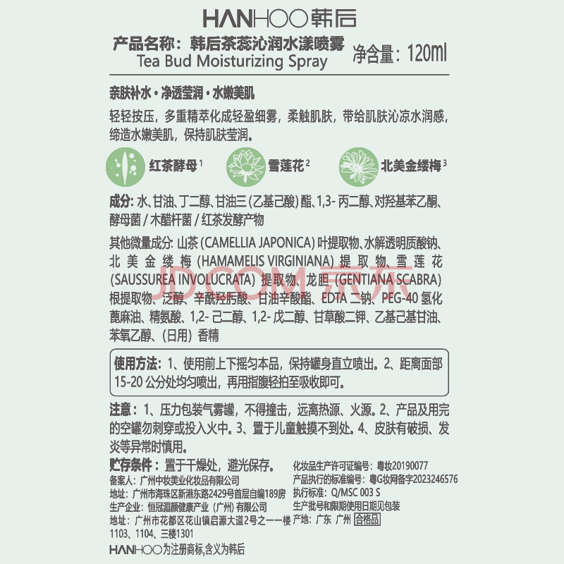 商品相册:韩后茶蕊沁润水漾喷雾120ml 女士爽肤水补水保湿滋润护肤面部定妆湿敷第