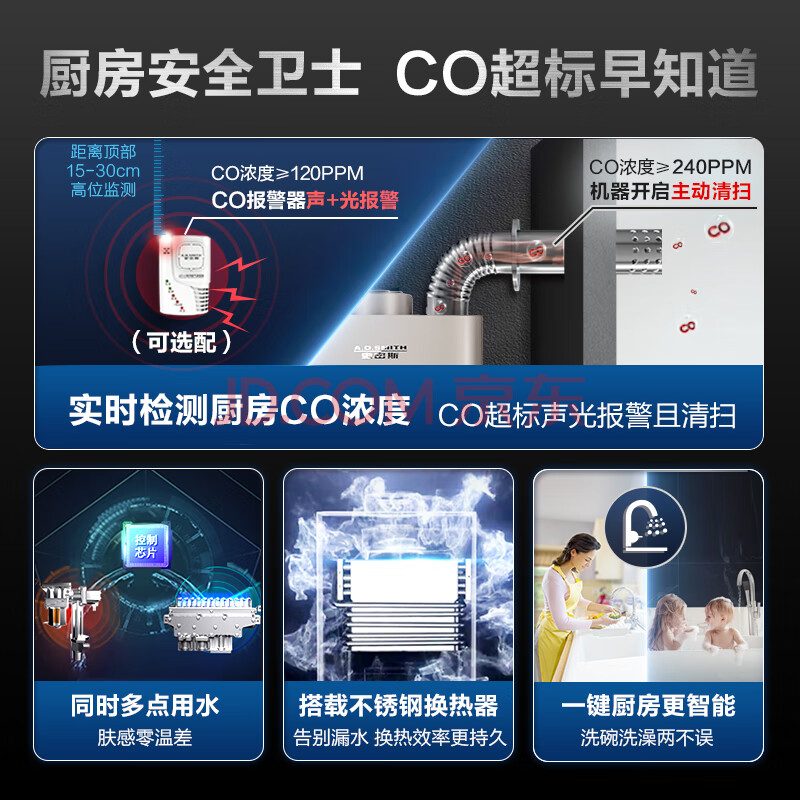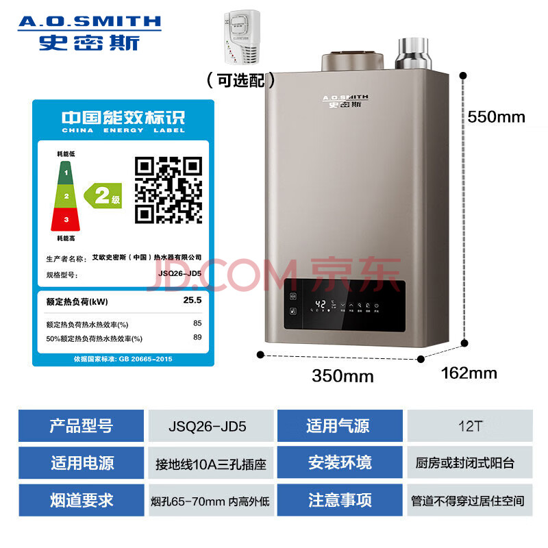 商品相册:史密斯(A.O.SMITH)13升精钢燃气热水器 不锈钢换热器包8年 负压燃烧更安全 恒温大水量 家用天然气 JSQ26-JD5第
