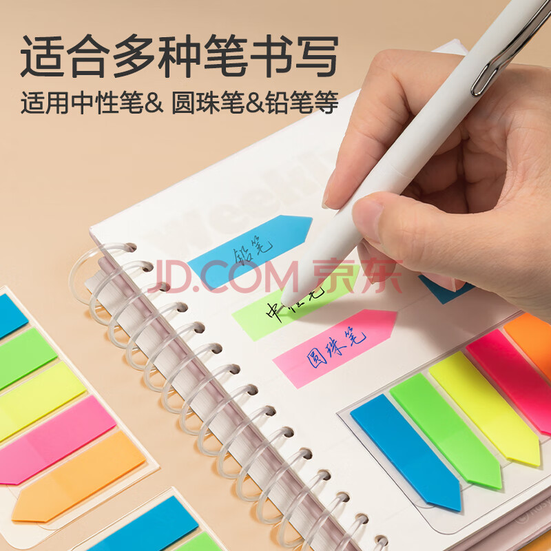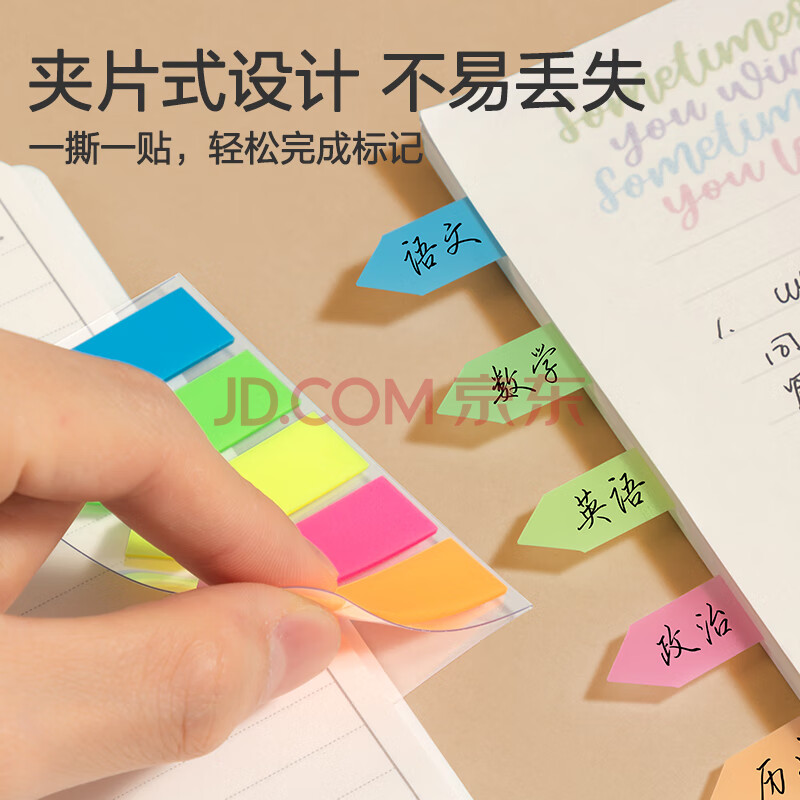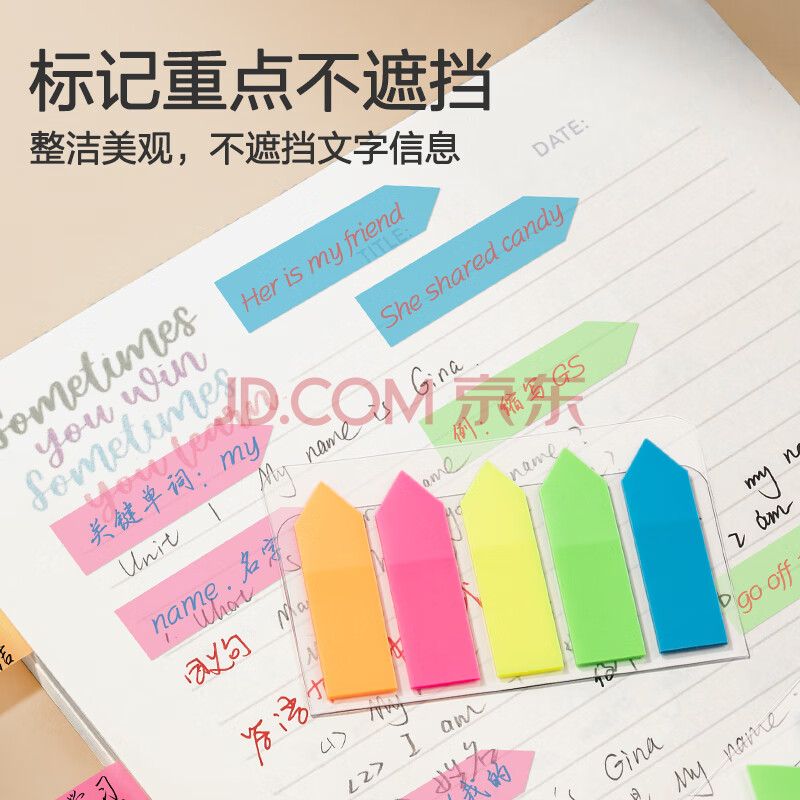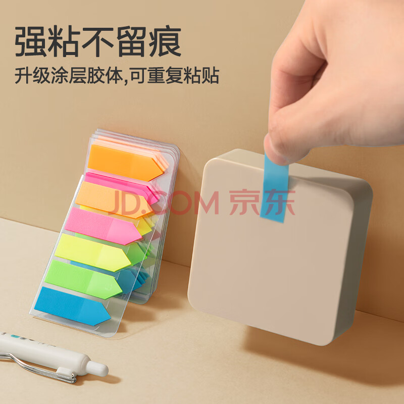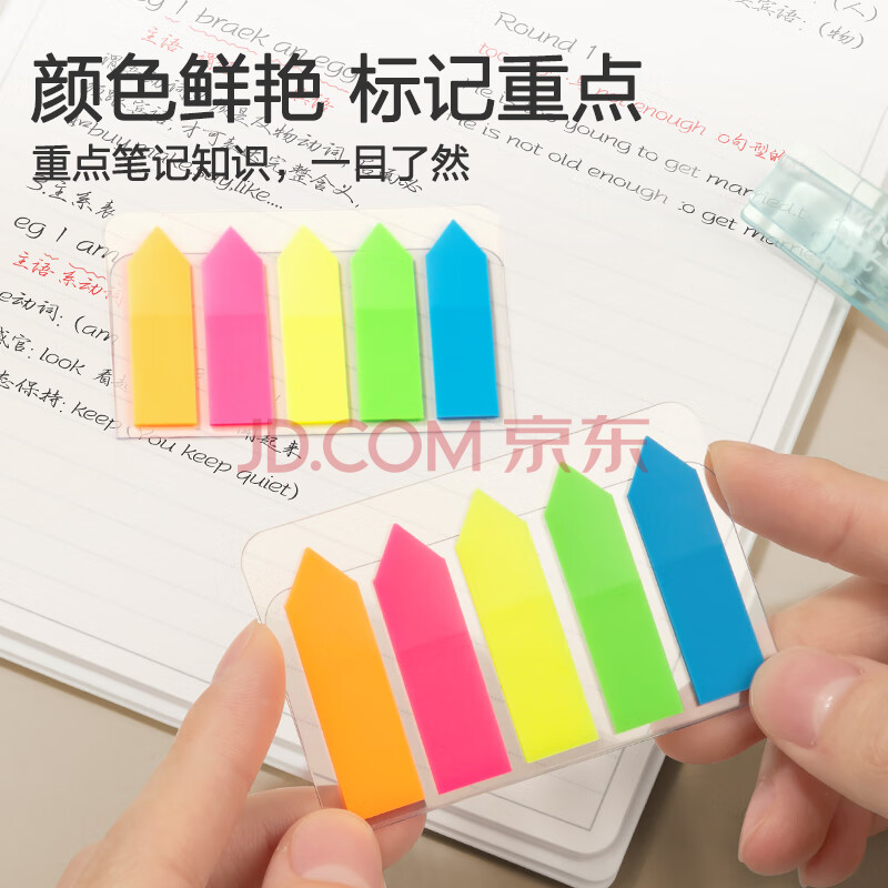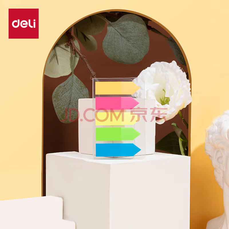 商品相册:得力(deli)100张5色荧光膜指示标签贴 43*12mm箭头款分类索引便利贴记事贴9064第