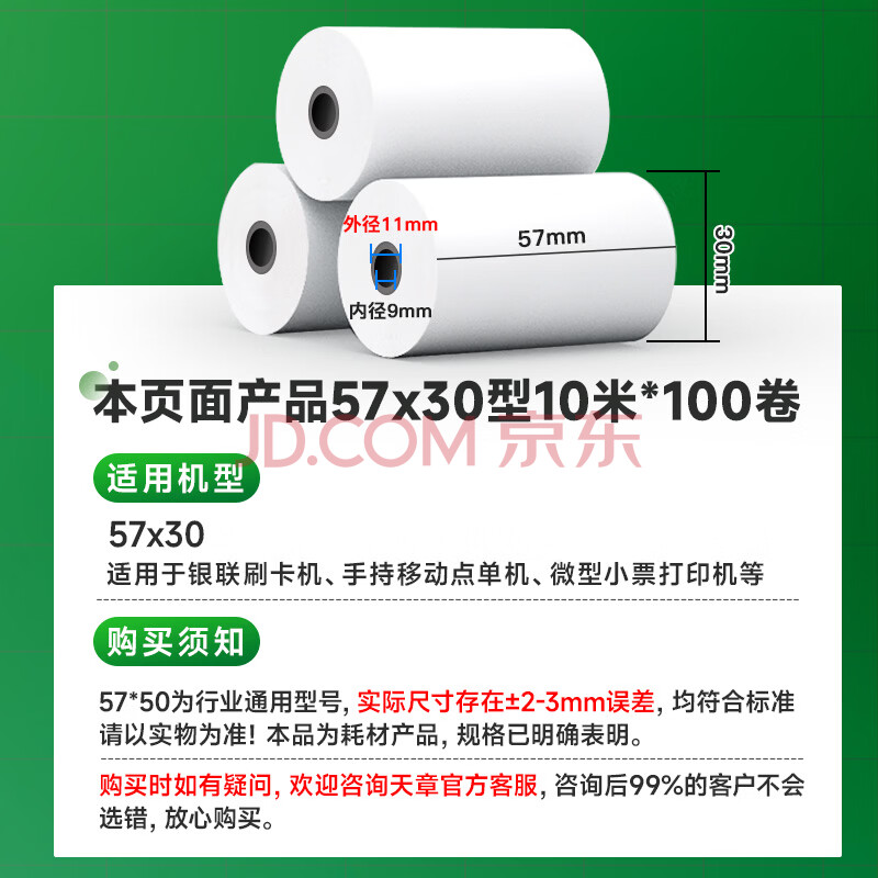 商品相册:天章 (TANGO)57*30mm10米*100卷 新绿天章 热敏收银纸京东外卖餐饮小票银联移动点单打印纸 适配58mm机器 P3441第