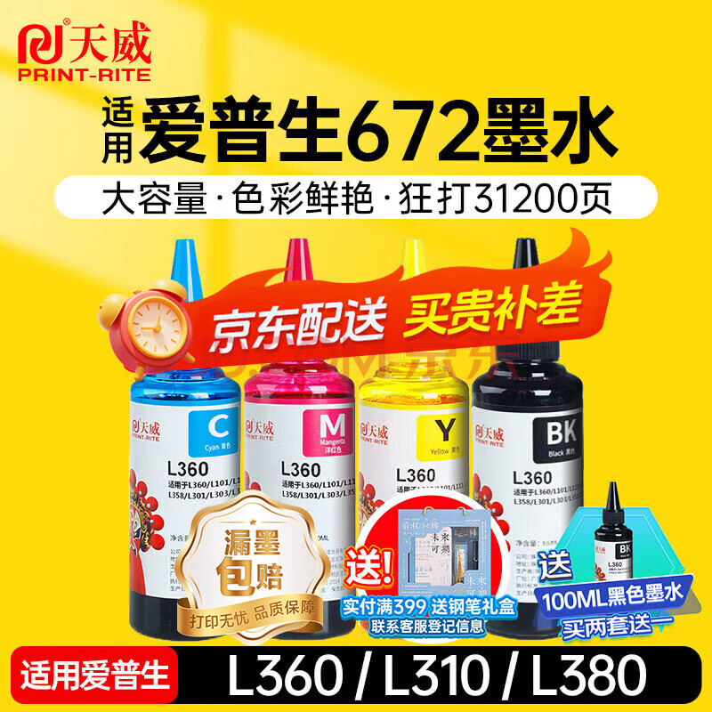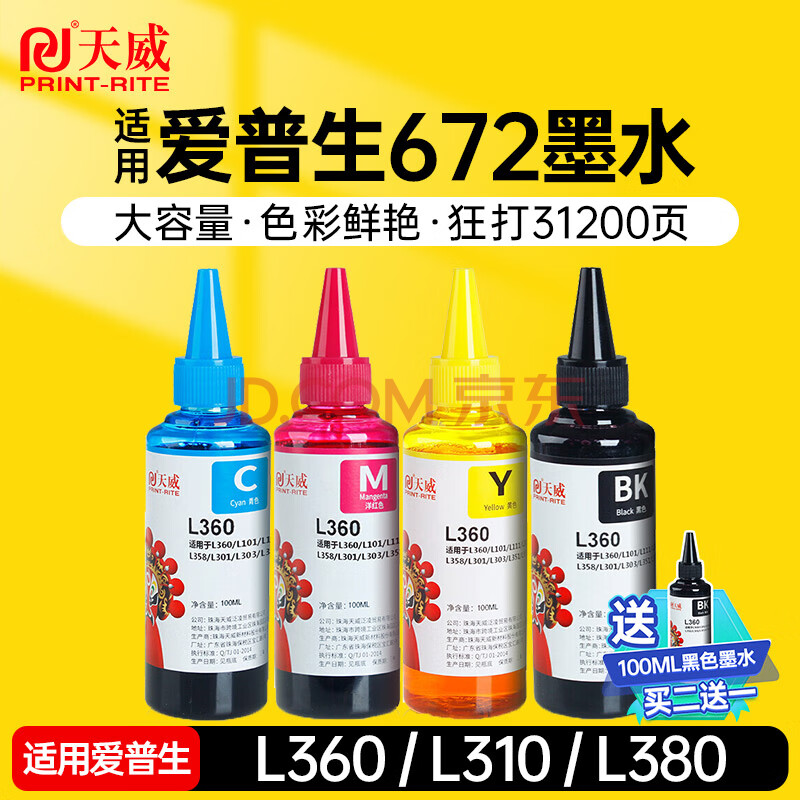商品相册:天威 T672墨水100ml 4色套装 适用爱普生打印机墨水EPSON L360 L310 L380 L351 L130 L313 L301 L1300 L383第