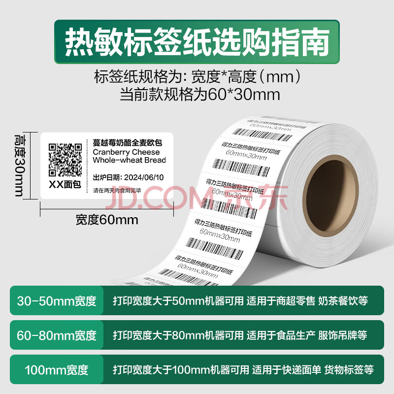商品相册:得力60*30mm 800张*1卷 珊瑚海三防热敏标签纸 食品服饰不干胶打印纸 12017【适配3寸标签机720C等】第