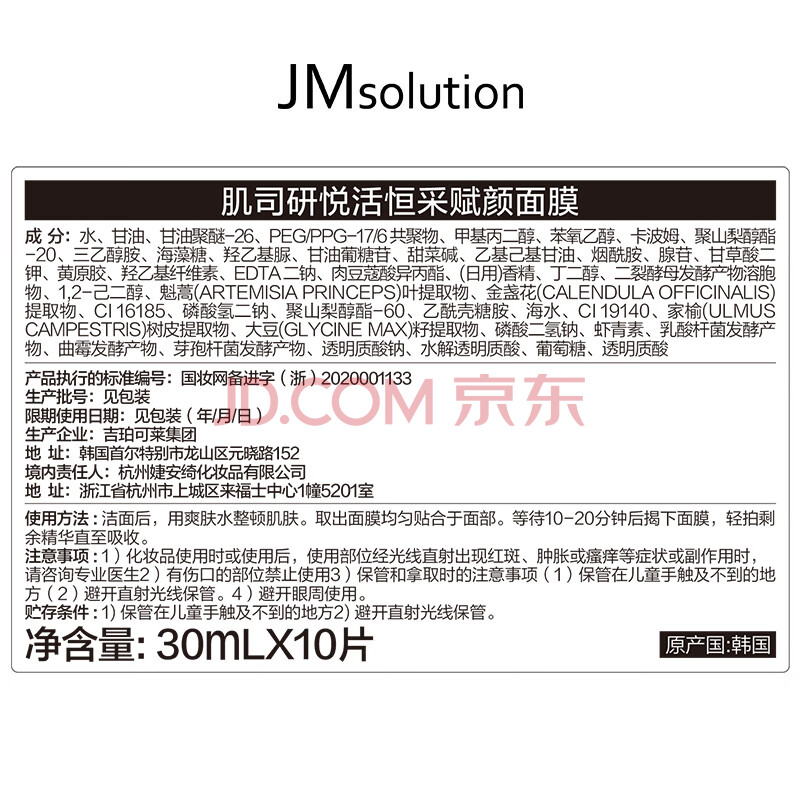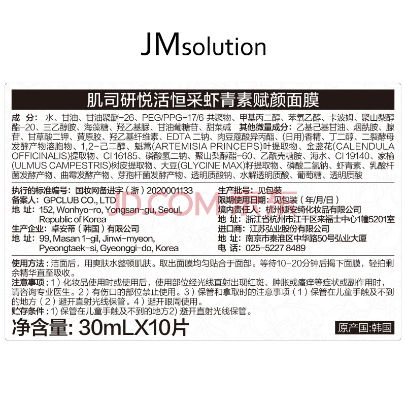 商品相册:JMsolution肌司研悦活恒采虾青素赋颜面膜30ml*10片 水润保湿 保湿修护第