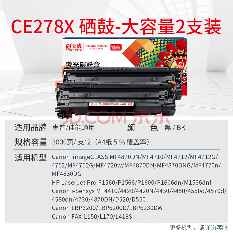 商品相册:天威278a硒鼓大容量2支装适用佳能LBP6230dn MF4712 4752 L150 MFP 惠普HP M1536dnf P1606dn打印机墨盒第