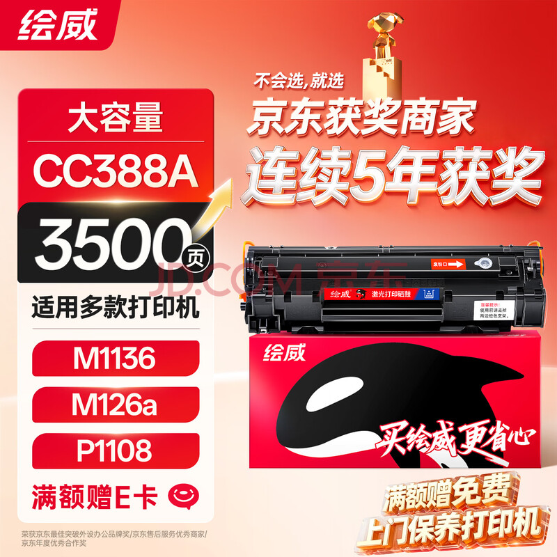 商品相册:绘威CC388A 88A硒鼓 适用惠普HP P1106 plus P1007 P1108 M126nw m126a M1136 mfp M1213nf M1216nfh打印机墨盒第
